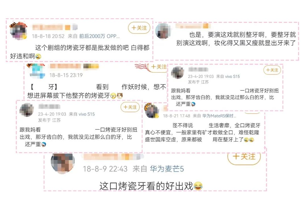 年初央視播放的年代劇,網(wǎng)友吐槽女明星演農(nóng)村婦女的時候:臉是臟的,穿著是土的,演技是在線的,但一口白晃晃的烤瓷牙,讓人瞬間出戲。前幾年的清裝大爆劇,男演員也因一口搶鏡大白牙被戲稱“牙親王”,彈幕調(diào)侃“大清的國庫都被皇親國戚拿去做烤瓷牙了,不亡沒天理!”